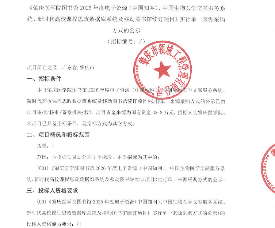 《肇庆医学院图书馆2026年度电子资源(中国知网)、中国生物医学文献服务系统、新时代高校课程思政数据库系统及移动图书馆续订项目》实行单一来源采购方式的公示