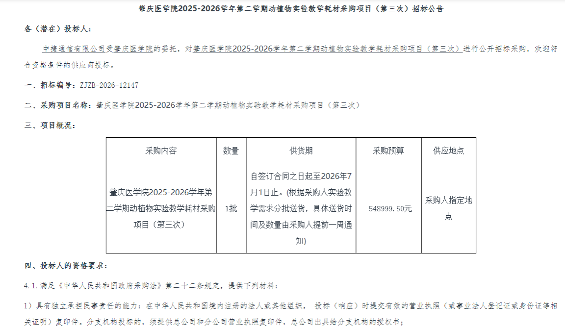 肇庆医学院2025-2026学年第二学期动植物实验教学耗材采购项目(第三次)[ZJZB-2026-12147]-招标公告