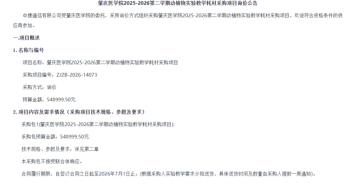 肇庆医学院2025-2026第二学期动植物实验教学耗材采购项目[ZJZB-2026-14073]-询价公告