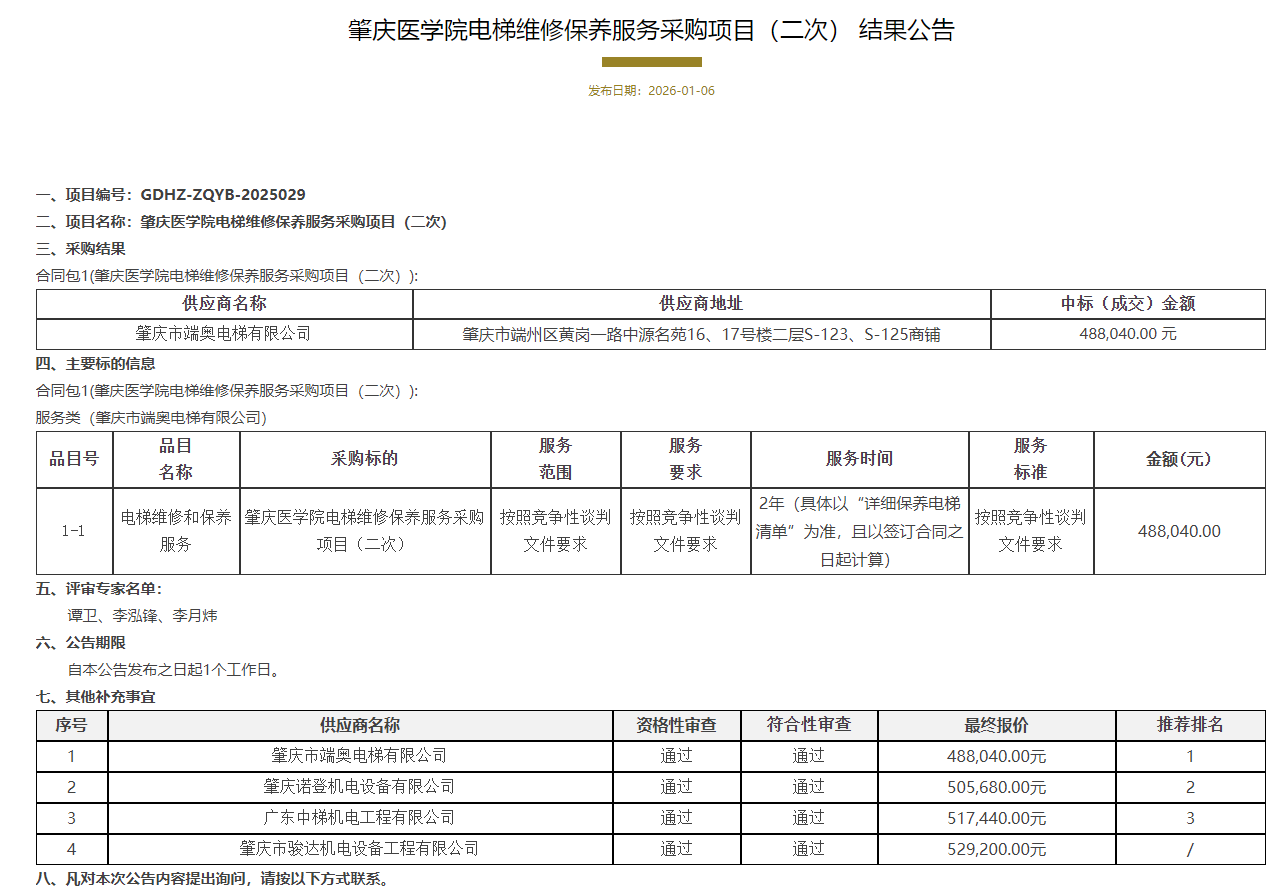 肇庆医学院电梯维修保养服务采购项目(二次) 结果公告